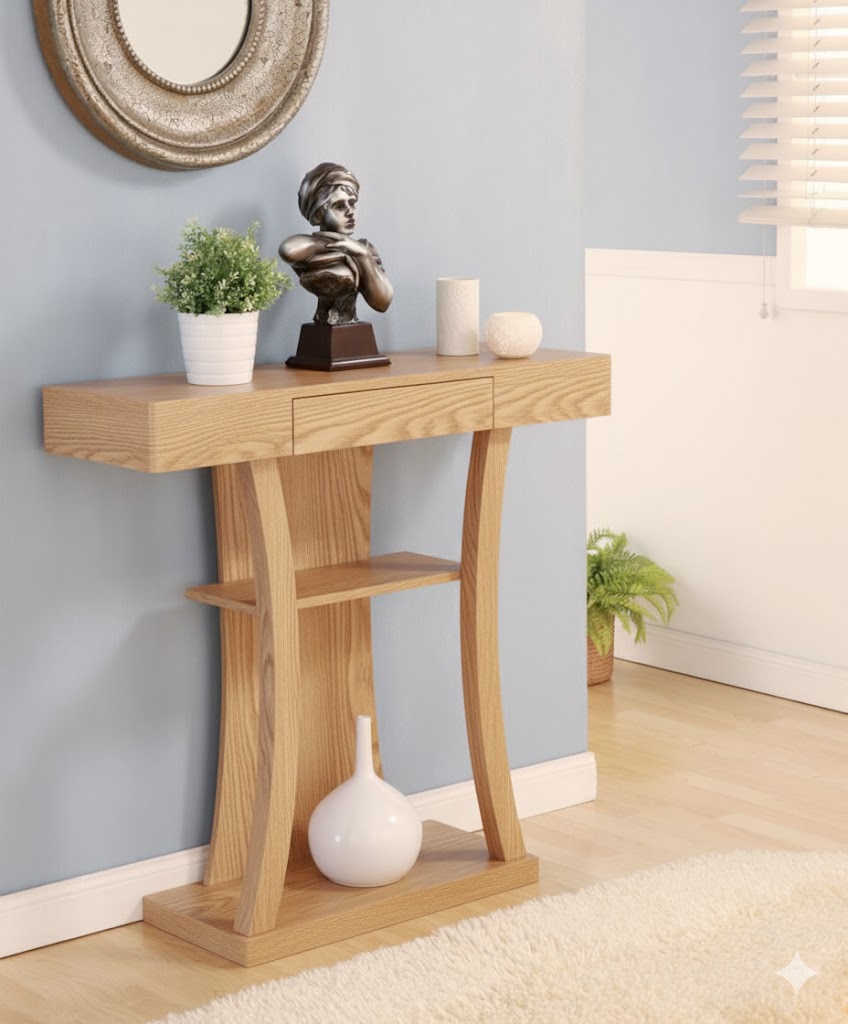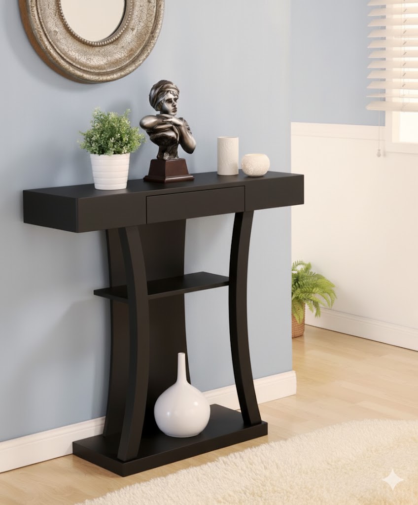 এই আধুনিক এবং মসৃণ কনসোল টেবিলটি একটি বসার ঘর বা হলওয়ের জন্য উপযুক্ত। টেবিলটির প্রধান অংশটিকে গভীর কালো রঙে রূপান্তর করা হয়েছে, যা এটিকে একটি মার্জিত (elegant) এবং নাটকীয় চেহারা দিয়েছে।